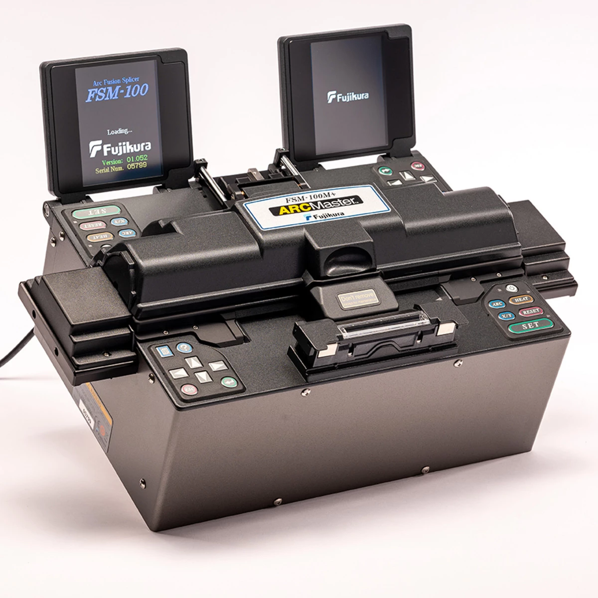 每个 ARCMaster FSM-100M+ 熔接机包括 FH-100-250 光纤支架(一对)、FH-100-250-EV 光纤支架(一对)、FH-100-900 光纤支架(一对)、ELCT3-25-LDF 电极(一对)、ELCT3-25 标准电极(已安装)、ADC-15 交流适配器、EV-LS01 端视光源、ACC-02 交流电源线、USB 电缆、灰尘清洁棉签套装、EC-01 电极清洁器、CD 上的操作手册和软件以及运输箱。