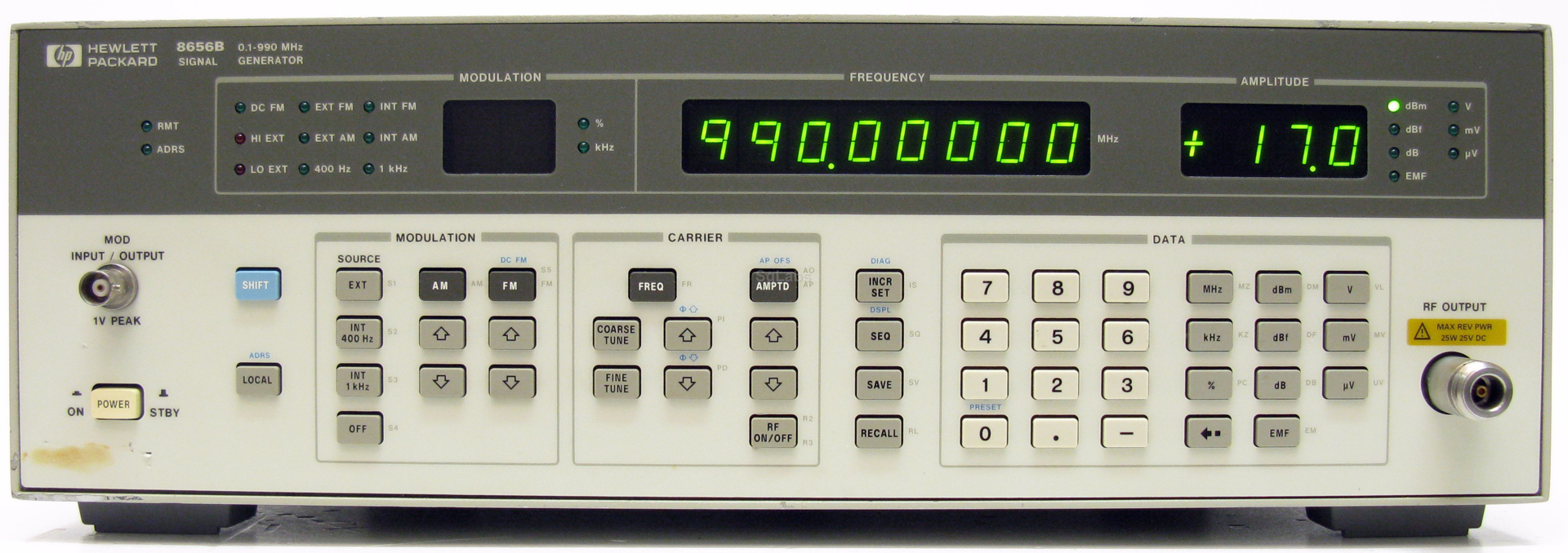 The 8656B is a 990 MHz RF generator from Agilent. An RF generator is a tool used by engineers to produce sinusoidal outputs when testing electronic devices. The output will automatically change its frequency or scan between frequencies. "Scanning" is a complete cycle of frequency change. Engineers use RF signal generators as test devices, primarily to measure the response of filters, amplifiers, and electrical components. The Agilent 8656B provides precise output control. In addition, its modulation capabilities include simultaneous and hybrid modulation modes from internal (400 Hz and 1 kHz tones) and external sources. These features create a universal signal generator that can be used in a variety of applications.
