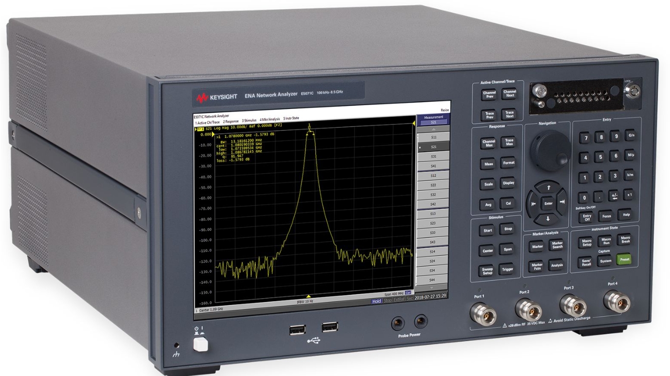 The Keysight E5071C (Agilent) network analyzer offers the highest RF performance and fastest speeds in its class, along with a wide frequency range and versatile features. The E5071C is the ideal solution for manufacturing and R&D engineers evaluating RF components and circuits in the frequency range up to 20 GHz.