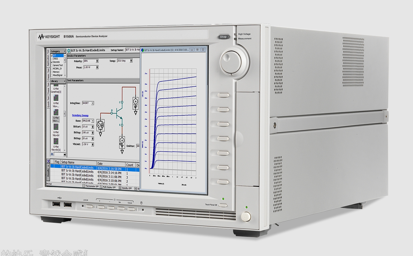 The  Agilent B1500A Semiconductor Device Analyzer is a modular instrument with a ten-slot configuration that supports both IV and CV measurements and also fast high-voltage pulsing. Its familiar, Microsoft ® Windows ® user interface supports Agilent’s EasyEXPERT software, which provides a new, more intuitive task-oriented approach to device characterization. Because of its extremely low-current, low-voltage, and integrated capacitance measurement capabilities, the Agilent B1500A  can be used for a wide range of semiconductor device characterization needs (IC-CAP supports the B1500A). It is also an excellent solution for non-volatile memory cell characterization and high-speed device characterization (including advanced NBTI measurement).