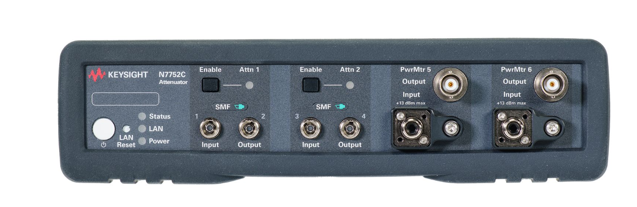 The N7752C combines 2 variable optical attenuator channels for single-mode fiber with 2 additional, independent optical power meters.The N7752C two-channel variable optical attenuator for single-mode fiber enables highly efficient optical transceiver and network integration testing. It is equipped with two additional, independent optical power meters and based on electrically controlled variable optical attenuator (VOA) modules.