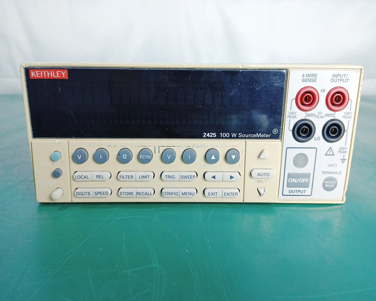 The Keithley 2425 100V/3A/100W SourceMeter SMU instrument is designed for test applications that require tightly coupled sources and measurements. The 2425-C provides precision voltage and current sources and measurement functions; it is both a highly stable DC power supply and a true instrument-grade 6 1/2-digit multimeter. Power characteristics include low noise, accuracy, and readback. The functions of the multimeter include high repeatability and low noise. The result is a compact single-channel DC parameter tester. In operation, this instrument can be used as a voltage source, current source, voltmeter, ammeter and ohmmeter. Communications, semiconductors, computers, automobiles,