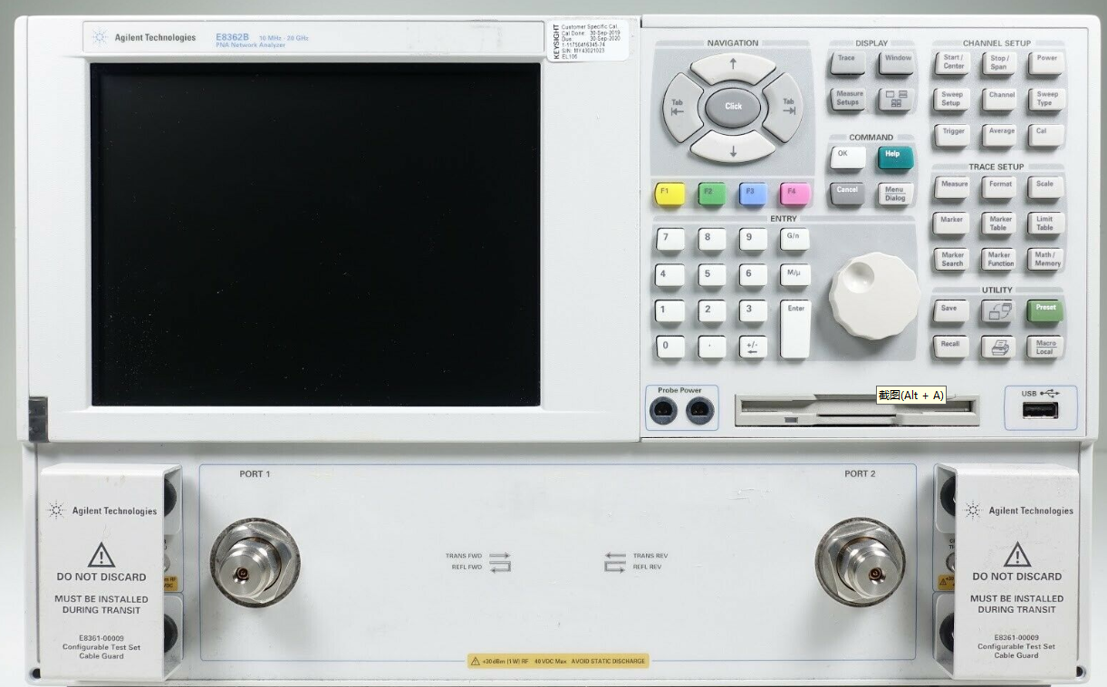 The E8362B 10 MHz to 20 GHz RF network analyzer is suitable for testing passive and active devices, such as filters and amplifiers. Users can easily add options to test mixers, harmonics, intermodulation distortion (IMD), pulsed RF, antennas, and millimeter wave (mmwave) components.