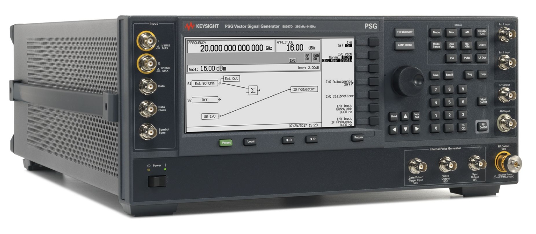 The Agilent E8267D PSG vector signal generator is the industry's first integrated microwave vector signal generator with I/Q modulation up to 44 GHz. It features an advanced wideband internal baseband generator that is capable of flexible arbitrary waveform playback or complex real-time signal generation. The E8267D PSG also features a built-in wideband I/Q modulator that delivers up to 2 GHz RF modulation bandwidth and is a perfect complement to Agilent's N6030A standalone wideband arbitrary waveform generator for I/Q waveform simulation up to 1 GHz RF bandwidth. Available only in the E8267D PSG, this ground-breaking integrated vector capability greatly simplifies the generation of complex modulated signals for design and manufacturing test applications in aerospace, defense, satellite communications, and broadband wireless.