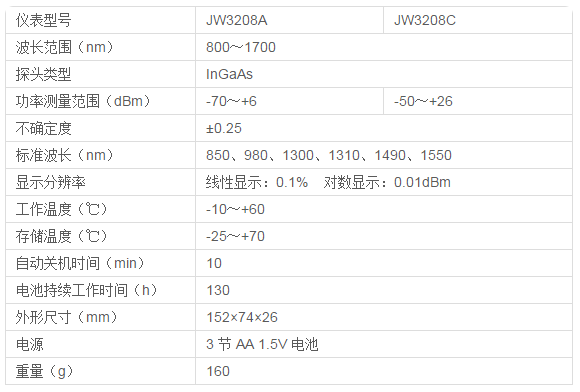 JW3208可自校准型手持式光功率计是为安装、运营和维护光纤网络专门设计的一种精准、耐用、便捷的便携式测试仪表。具有灵巧的外形、可选择开关的背光显示、自动关机功能、超宽的光功率测试范围、精准的测试精度以及全新的用户自校准功能和通用接口设计。