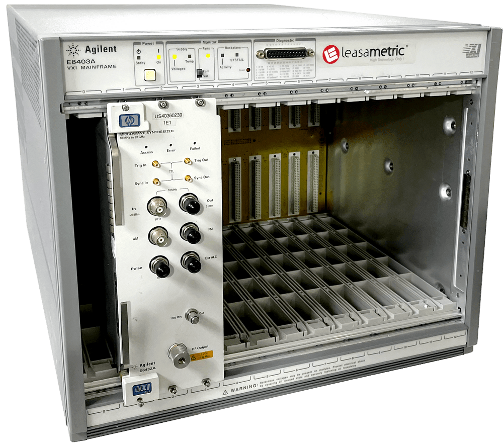 The Keysight E8403A C-size, 13-slot VXI mainframe provides a balance of high-power and reasonable cost. It delivers innovative cooling technology, improved backplane design, high reliability, easy maintenance, and versatile accessories. The power supply in the E8403A mainframe provides 1000 watts of usable power, sufficient for the most demanding automated test applications. The innovative air distribution system provides extremely quiet and efficient cooling. Basic mainframe monitoring of the E8403A indicates normal operating conditions at a glance. A front panel diagnostics connector allows continuous local or remote system monitoring. This mainframe also complies with the VXI Specification by providing injector surface rails used by the Keysight QUIC easy module and extraction system. Superior cooling, reliable design, and system monitoring make the E8403A an excellent choice for all VXI test system applications.