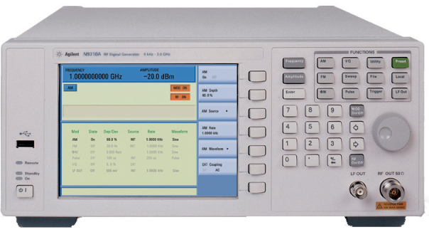 The N9310A RF signal generator covers the frequency range of 9 kHz to 3 GHz. It is reliable, easy to use and inexpensive, making it ideal for applications such as initial research and development, maintenance services, manufacturing and education.