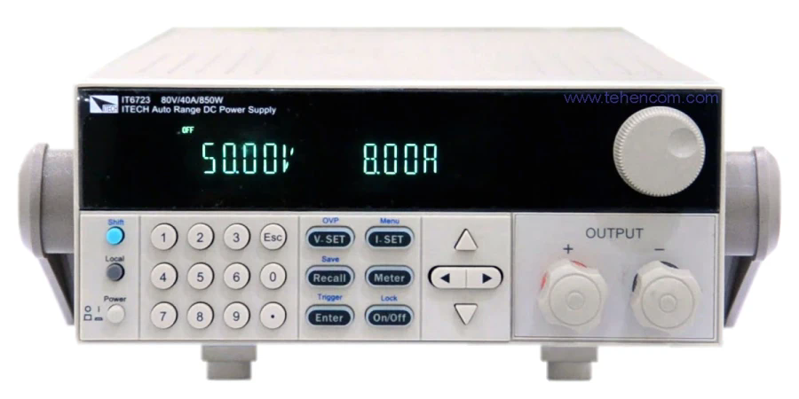 ITECH IT6723C is a laboratory DC power supply with output voltage up to 32 V and current up to 110 a. The maximum output power of the load is 850w. The IT6723C power supply has a list mode (up to 150 steps), overload protection of all types and the ability to connect in a 4-wire circuit for increased accuracy at large currents.