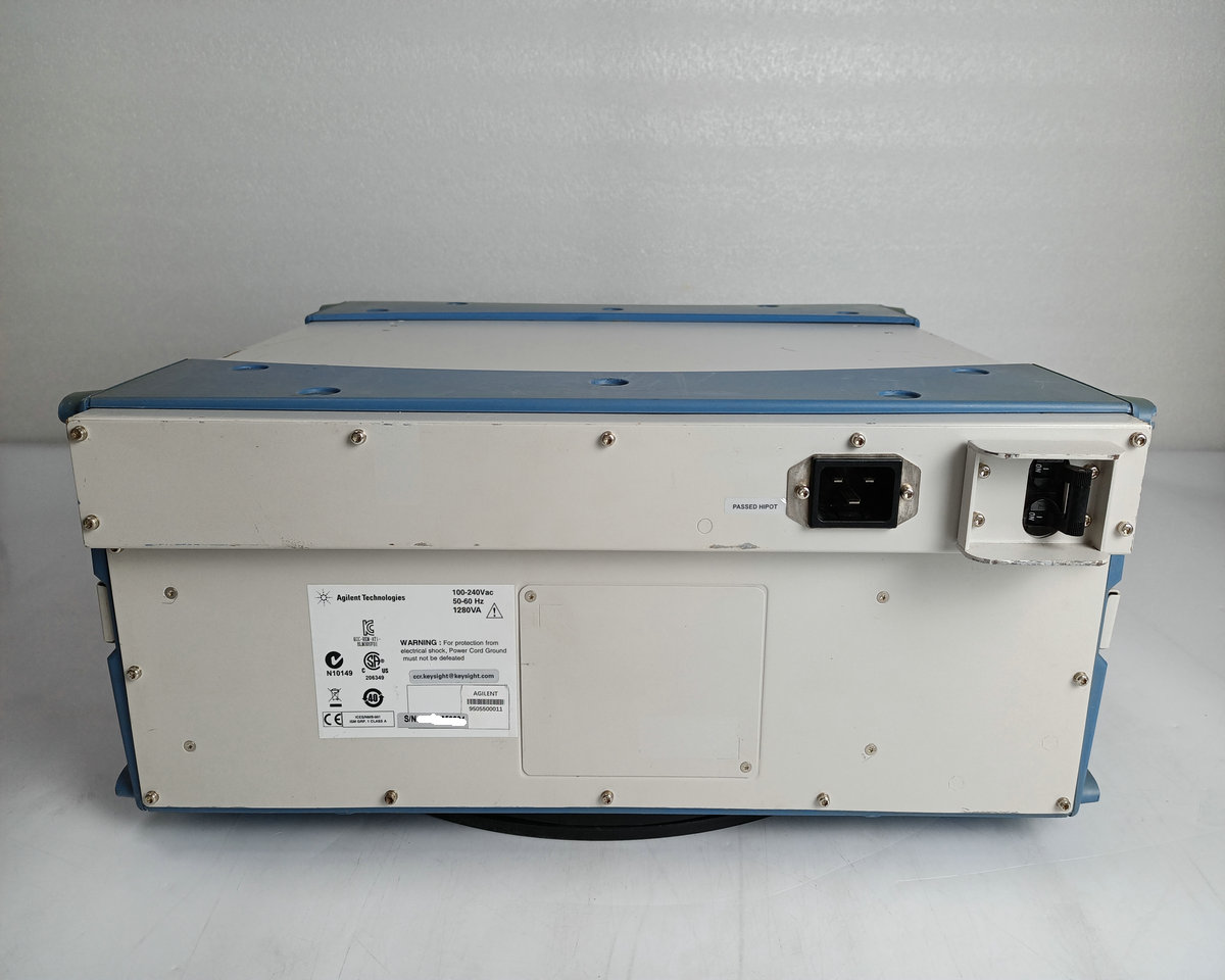 The instrument module slots are arranged horizontally to minimize rack space. This arrangement, combined with a high-performance cooling system, allows the chassis to fit in only 4U of rack space. The M9505A is also designed to be easy to maintain, as both the power and fan brackets can be removed while the case is left in the rack.