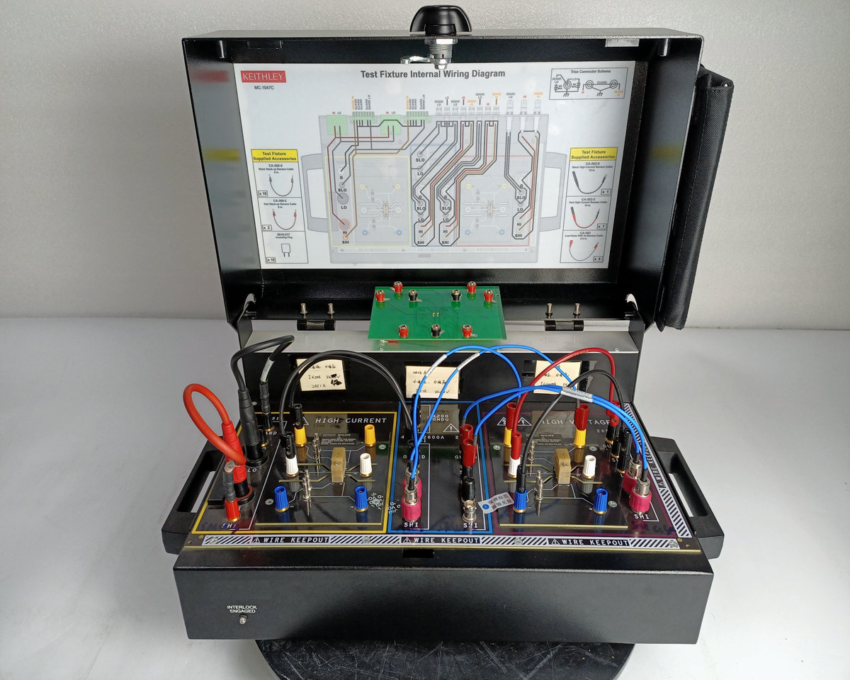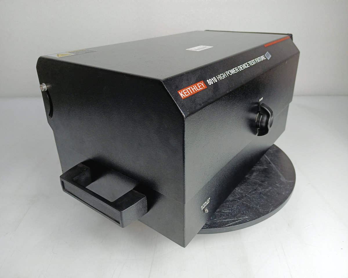 The Keithley 8010 High Power Device Test fixture provides a safe and simple connection for testing packaged high power devices up to 3000V or 100A. The model 8010 is a high-voltage SourceMeter instrument (Model 2657A), one or two high-current SourceMeter instruments (Model 2651A) and three low-power SourceMeter instruments (other 2600A series or model 4200-SCS source measurement units) (SMU) instrument) provides the connection. In this way, devices with 2 terminals (diodes) or 3 terminals (transistors) or even 4 or 5 terminals can be safely and accurately characterized. The model 8010 is fully interlocking and can be connected to up to six SourceMeter instruments. The Model 8010 has an integrated protection circuit to protect the low-voltage SourceMeter instrument from the high-voltage output of the Model 2657A in the event of equipment failure. The Model 8010 includes a high current (100A) and a high voltage (3000V) test socket. A variety of replacement test socket modules are available, including TO-247, TO-220, axial leads, and blank socket modules that allow the construction of custom sockets. In addition to the standard banana jumper, the Model 8010 features a rear panel oscilloscope and thermal probe ports to simplify system integration.