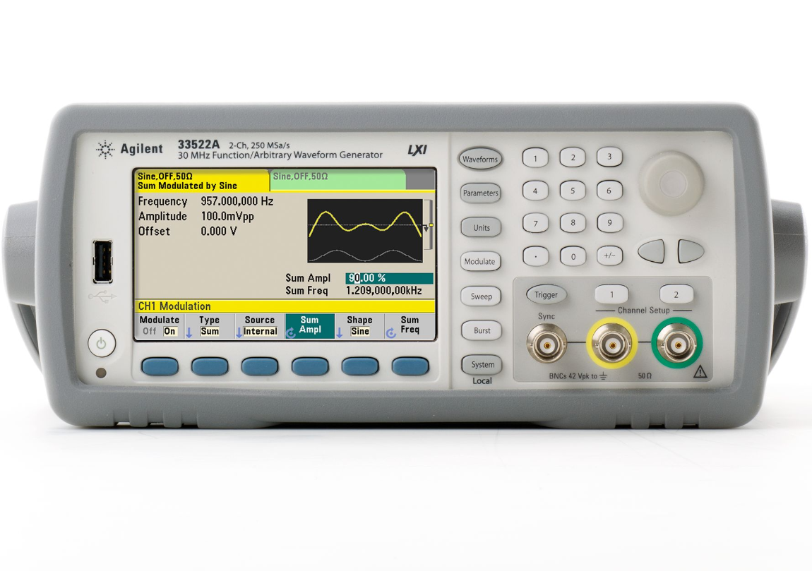 The Agilent 33522A is a 2-channel 30 MHz function / arbitrary waveform generator. The 33522A offers the highest signal fidelity and implements a breakthrough technology that provides you with the ability to generate more accurate arbitrary waveforms. With 10x better jitter than anything in its class, it offers unparalleled control of signal frequency for your most challenging measurements.