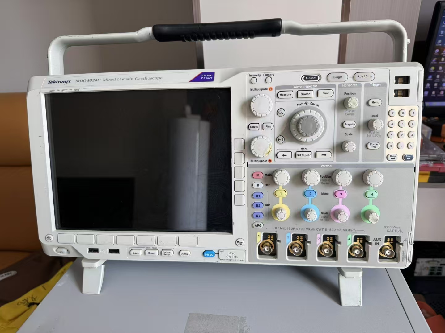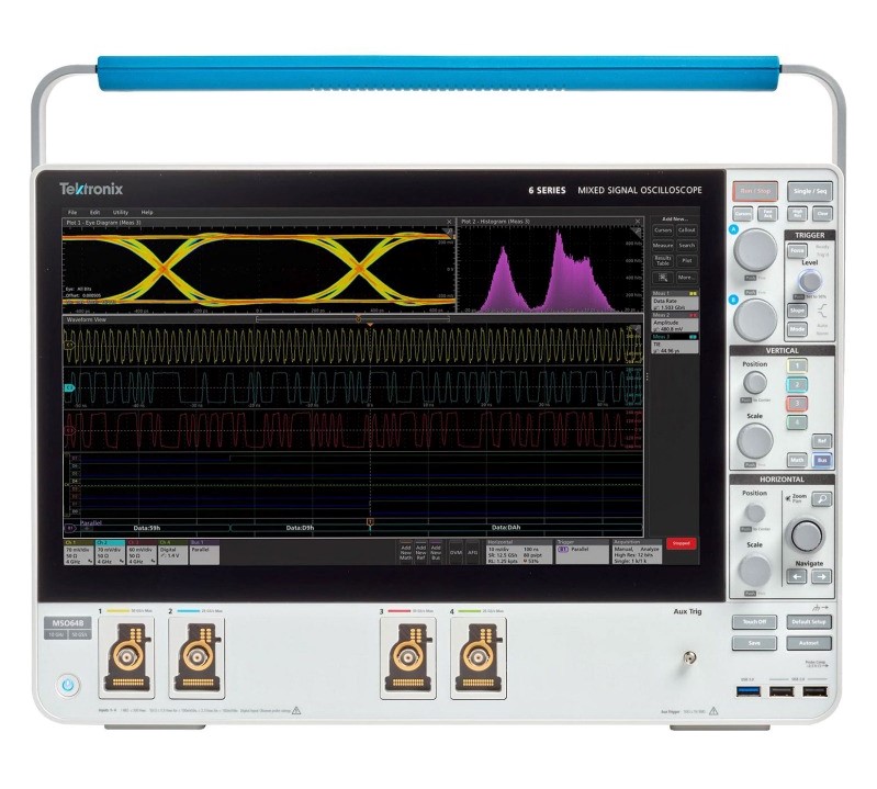 The Tektronix MSO54 provides a better understanding of complex systems by offering six analog channels and a large 15.6" HD (1,920 x 1,080) display. Many applications, such as embedded systems, three-phase power electronics, automotive electronics, power supply design, and DC-DC power converters require the observation of more than four analog signals to validate and characterize device performance and debug challenging system problems, and digital channels share the same high sampling rate (up to 6.25 GS/s) for fine timing. The resolution and long recording length (up to 125 Mpoints) allow for long time capture as an analog channel.