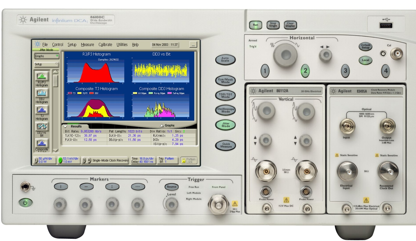The 86100C Infiniium DCA-J combines extremely high accuracy and repeatability with outstanding ease of use to simplify characterizing signals from 50 MHz to 80 GHz. Digital designers can combine the mainframe and modules into four key instruments with industry leading signal integrity performance, including: